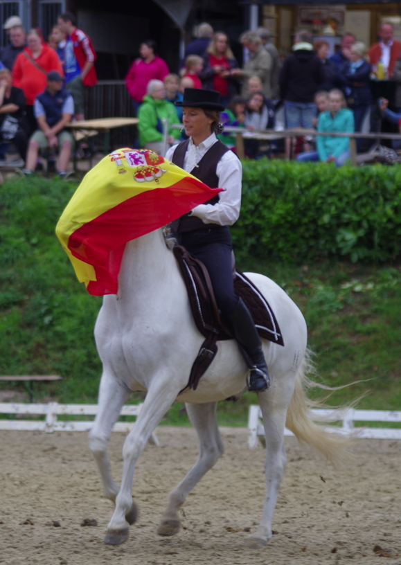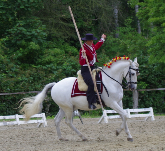 Und so startete ich mit Joya in der ersten Kür mit der Garrocha. Beim Abreiten war er reichlich frech, ungeheuer fein an den Hilfen (überfein, ich durfte kaum ran) und überdreht. Ich probierte schließlich freihändig und schnallte den Gürtel prompt deutlich kürzer als zu Hause und hatte schon ein bisschen Sorge, dass er nur ja nicht anfing, zu steigen. Das hätte verheerend werden können.