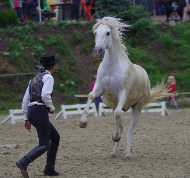 Zum Schlussgruß ließ ich ihn steigen, er war einen Moment überrascht. Das Steigen war nicht sonderlich hoch, also fragte ich ein zweites an. Jetzt war er nicht mehr überrascht. Meine Güte! Einen Moment dachte ich, das kann er nicht halten. Er stieg so kerzengerade und blieb einen Augenblick oben, weil er sich da echt ein wenig verschätzt hatte. Ich schnappte nach Luft. Was für eine Kraft. Puh!