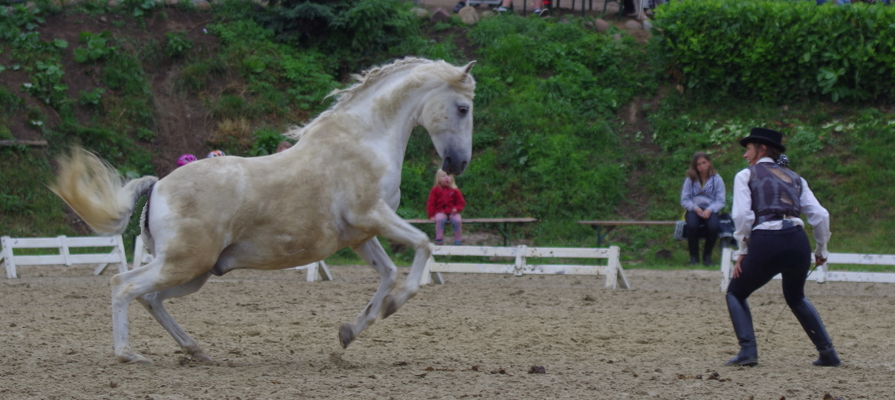 Noch einmal ein wenig umziehen für das Schaubild. Headset anlegen, los ging’s. Ich erzählte ein wenig, worauf es beim Reiten mit Halsring ankommt, wie man anfangen kann und wie sich die Hilfengebung verändert und Joya machte schön mit. So langsam wurde er ein bisschen ruhiger. Aber auch nur ein bisschen. Ein Schnalzer zu viel und ich hatte 1000 Volt unter mir. Ich versuchte, keinen zu viel zu machen und bekam einen tollen Spanischen Schritt und Spanischen Trab. Und nicht nur das. Das interessierte und begeisterungsfähige Publikum applaudierte immer wieder zwischendurch bei guten Momenten. Zu und zu schön!