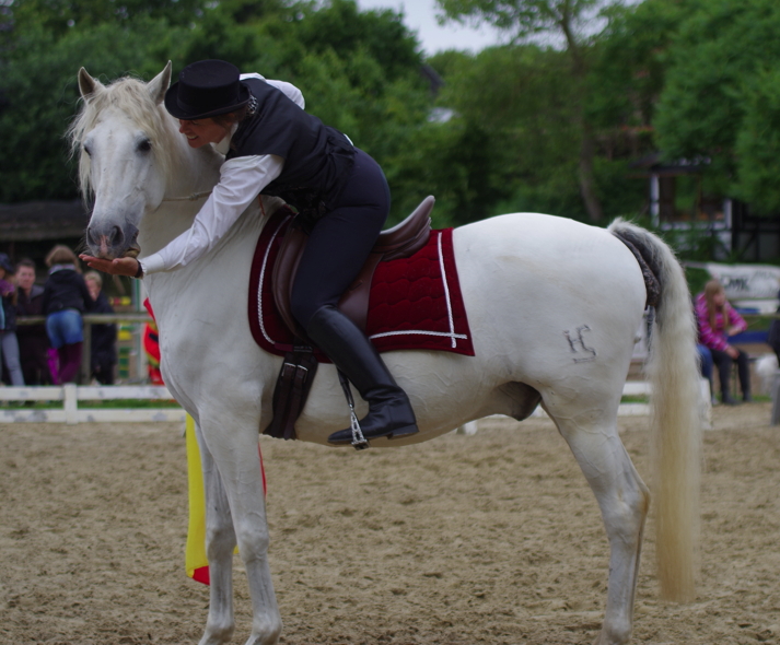 Also machte ich nichts gegen diese tollen Galoppsprünge, sondern nutzte sie – zur Musik passte ohnehin nichts mehr, er war viel zu früh angaloppiert, also lächeln und nehmen, was geht. Patentrezept, um ihn wieder auf meine Seite zu bringen. Er machte danach wieder toll mit, ging einen großartigen Spanischen Trab, schöne Trabtraversalen und eine tolle Pirouette.