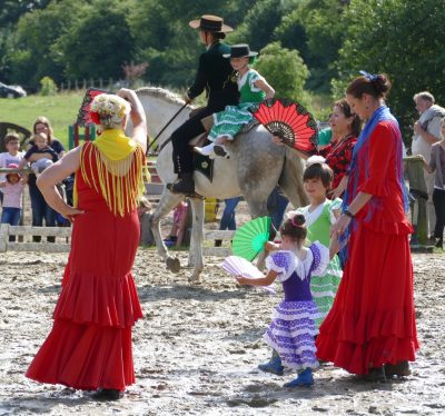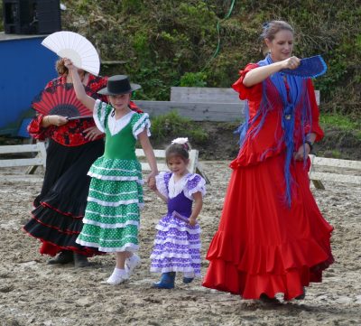 Dann kamen auch Gerda und Fatma, und damit war die Truppe für Dóns offene Kür komplett. Fatma kannten wir noch nicht, Gerda hatte kurzfristig gefragt, ob sie mittanzen könne und ich freute mich. Drei Erwachsene, drei Kinder – perfekt! Fatma war ungeheuer sympathisch, zeigte keinerlei Angst vor den Pferden und sah in schwarz/rot so schick aus. Auch aus den anderen wurden nun so nach und nach Señoritas.