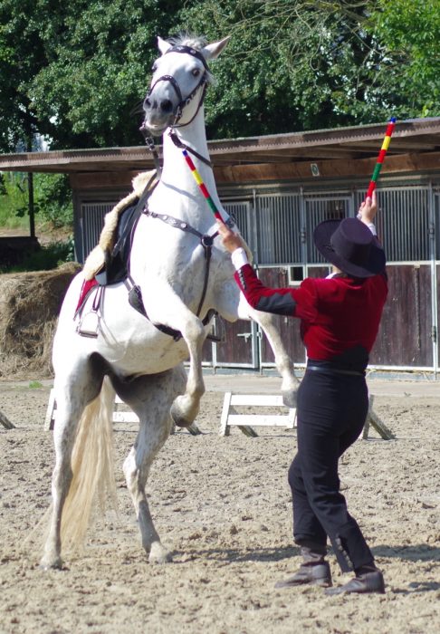 Die Leute klatschten, ich sprang ab, zum Glück ließen sie die Musik laufen, denn nun kam ja noch der Teil am Boden. Nacariño war sichtlich überrascht, dass er auf einen Impuls dieser beiden bunten Stangen, die er bewusst glaube ich noch nie gesehen hatte, steigen sollte. Er tat das zögernd und überrascht und fragend, zu süß. Da ihm das nicht ganz geheuer war, drehte er sich langsam weg, aber nicht so, dass er abhauen konnte, sondern sichtlich eher in dem Wunsch bei mir zu bleiben, aber ich möge ihm doch bitte erklären, was das jetzt soll? Ich lachte, streichelte ihn, nahm ihn an die Hand, ließ ihn neben mir angaloppieren, er machte wirklich völlig verblüfft einfach mit, ich ließ ihn sofort wieder los, er galoppierte frei neben mir, und dann ließ ich ihn nochmal steigen. Er machte es, wieder etwas fragend, und dann hörte ich, dass gleich die Musik zu Ende sein würde und dieses Ende wäre perfekt für einen Schlussgruß im Kompliment…