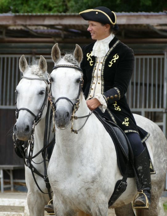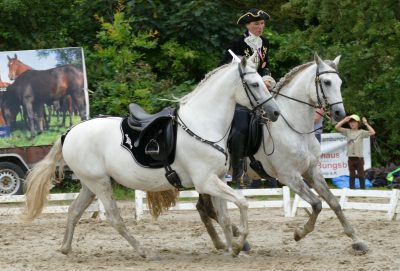 Ich ritt na klar die Siegerehrung mit Handpferd. Irgendwer fragte, ob ich auch von dem einen auf den anderen umsitzen könne. Verstanden hatte ich, ob ich die beiden von rechts nach links vertauschen könne und ich hatte natürlich ja gesagt. Nun verstand ich aber, dass nach umsitzen gefragt worden war, aber ich hatte ja schon ja gesagt 🙂