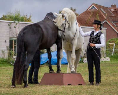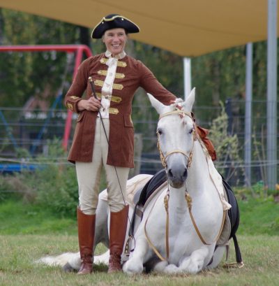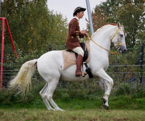 Dann Zirzensik und Podest, danach Spanischen Gruß / Schritt / Trab und verschiedene Formen von Galopp an der Hand und schließlich noch Ablegen und Steigen.