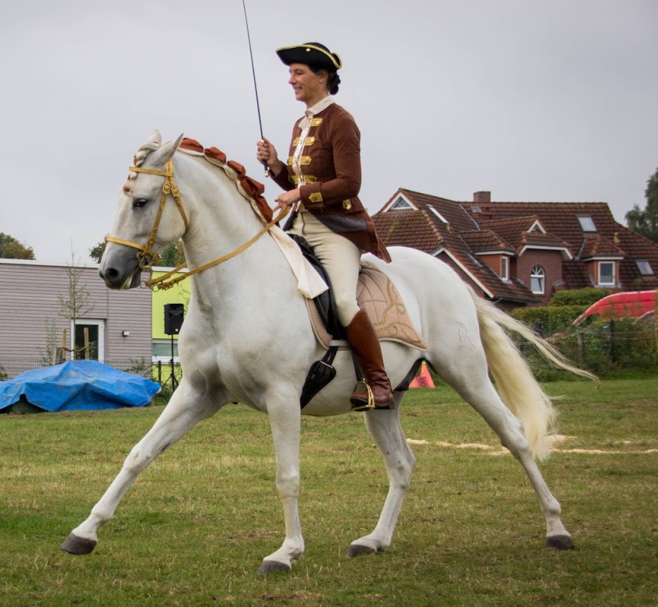 Unser erstes Schaubild war das Barocke Ensemble. Wir waren zu fünft und zeigten die Arbeit an der Hand, am Langen Zügel, Reiten mit Kandare/Unterlegtrense, einhändig blank und im Damensattel. Eine tolle Mischung der klassisch-barocken Reit- und Arbeitsweisen also. Mit einer ebenso tollen Mischung an Pferden! Dabei waren: