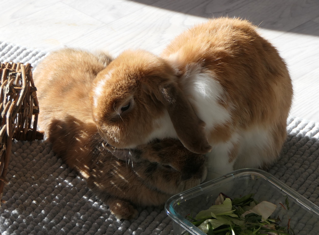 Für Quincy suchte ich einen neuen Partner, es sollte ein Kastrat in seinem Alter sein, und so fand ich „Caramel“, den ich umtaufte in Clooney. Er sollte angeblich im Januar 2015 geboren sein, womit die beiden nahezu gleich alt wären. Quincy und Clooney mochten sich vom ersten Augenblick an und ich habe selten so schnell und intensiv ein Kaninchen in mein Herz geschlossen wie Clooney.